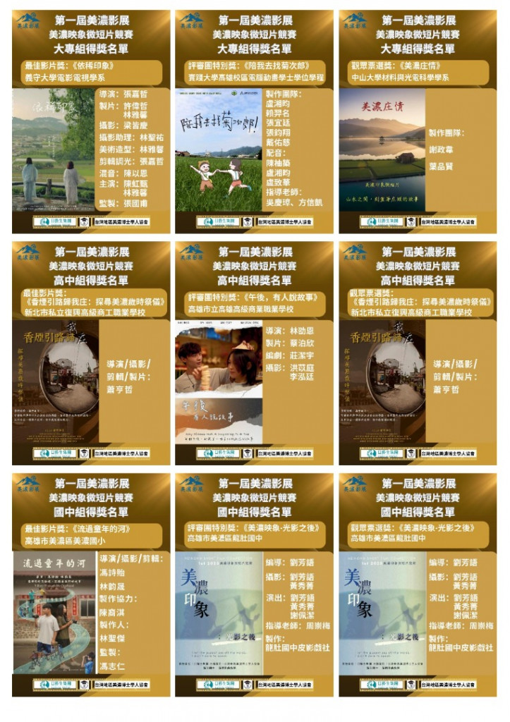 感謝所有參賽團隊熱情地參與第一屆「美濃影展-美濃映象微短片競賽」,頒獎典禮圓滿落幕。經由專家嚴謹的評選,來自大專、高中、國中之學生作品以紀錄、劇情、動畫與新媒體等多元型式,真誠呈現美濃的人文、自然與記憶;每一部作品都承載著珍貴的地方情感與創作者的心血。以下公佈得獎名單,恭喜所有獲獎與入圍的團隊與個人,並感謝所有參賽者為美濃留下動人的影像紀錄。